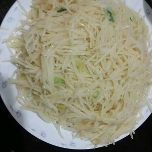 辅料煸出香味…放土豆丝…快速翻炒……土豆稍微变软就可以放醋…盐…另一半蒜…然后继续翻炒…放切好的葱花…马上关火!出锅