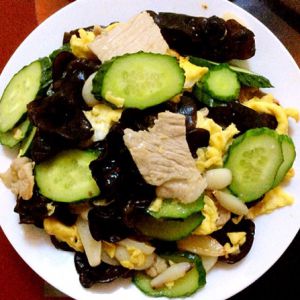 肉变色后加入蒜片爆香,再依次加入木耳,黄瓜和鸡蛋