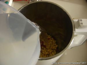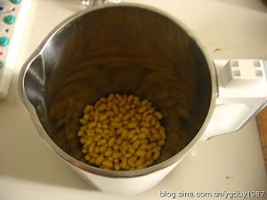 黄豆加水泡发,挑出不好的豆子扔掉。把豆子倒入豆浆机中。