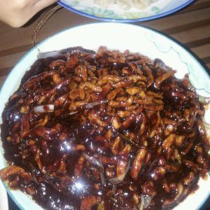 锅内留底油,加小部分葱,炒香。加入甜面酱,加一点料酒炒熟酱汁,放入炒好的肉丝,翻炒均匀后出锅。