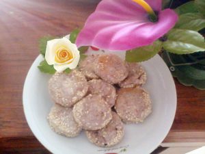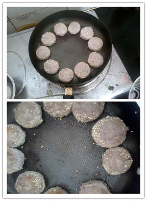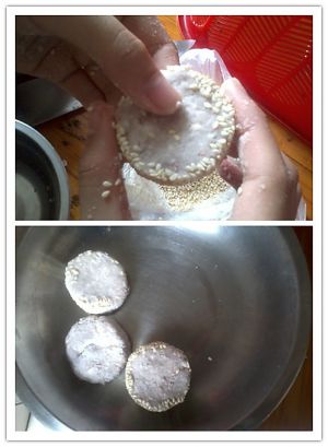 把芋头泥撵成喜欢的形状、在周边沾点水、粘上芝麻