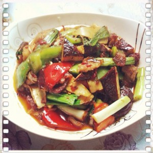 热锅下油,将五花肉煸炒至两面金黄,放冬笋翻炒片刻再放青、红椒,香豆干翻炒1分钟左右,再倒大蒜苗