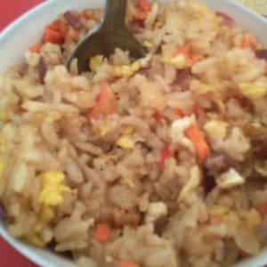 放米饭炒散,少放点海天酱油,少许盐,少许下糖。放入元葱炒出香味即可。