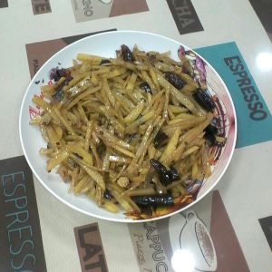 然后把土豆丝放入锅里炒,放入少许盐,白糖,醋,酱油(酱油是调色的)翻炒均匀,倒入少许水