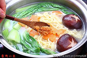 大火烧开转小火煮2分钟,放入蔬菜,待到油菜变软,加入白味噌调、少许胡椒粉味即可,出锅撒上大葱丝。点几滴蒜油即可