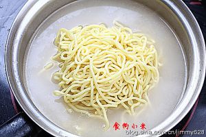 将骨汤里的骨头及作料捞出过滤一下,煮开后下入拉面