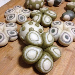 加一点碱,揉成绿色后一圈绿一圈白的包裹起来,揉匀切开