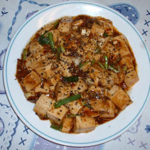 准备材料:豆腐切丁、牛肉切末、豆瓣酱、盐、酒、生红辣椒切碎、青蒜、姜末、花椒粉、水淀粉、酱油、少许糖。