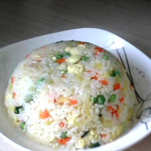 鸡蛋炒熟,出锅切碎待用,把切碎的黄瓜、胡萝卜及豌豆放入炒锅中翻炒,两分钟后加入菠萝,把米饭放到炒锅中,改小火不停翻炒,放入鸡蛋,撒上少许盐就可。