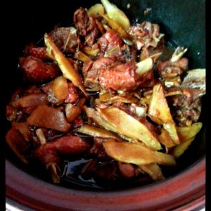 锅热直接下鸭肉煸炒,(我没放油)加蒜、子姜、辣椒炒会加生抽、一小块冰糖、老抽、杨梅酒、出味后加水