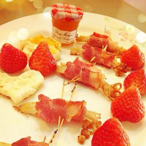 将焯熟的金针菇用培根裹起~用牙签固定~