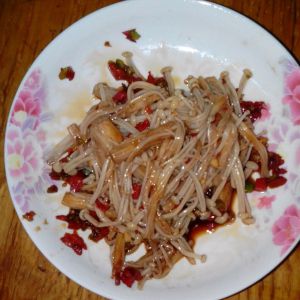 把调好的作料倒入盘中,搅拌即可食用,炎热的夏季一盘凉拌金针菇可以为你带来一丝丝凉意