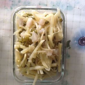 放适量的油,先把酸豆角,酸萝卜,泡椒,一起放入锅里翻炒,不必放盐,加少许鸡精,翻炒2分种将食材盛出备用