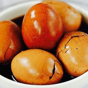 锅里加入肉皮(这个很关键)、适量的盐、酱油、桂皮、茶叶、大料等(有桂圆壳、核桃壳也可以加一点),再加入洗干净的鸡蛋,大火煮7分钟,把蛋敲碎,改小火煮15分钟,关火在汤里泡8小时以上入味!