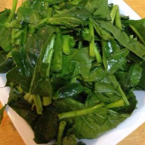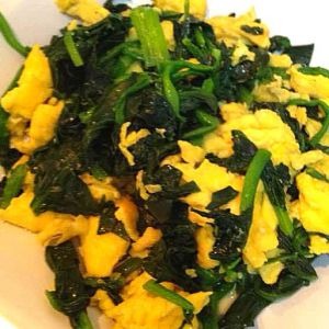 用摊完鸡蛋的油炒菠菜(如油不够可再添加),待菠菜变软放入适量盐。