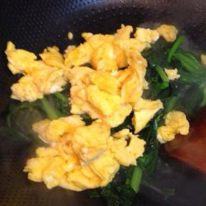 再快速倒入鸡蛋一起翻炒均匀,立即撒入香油。