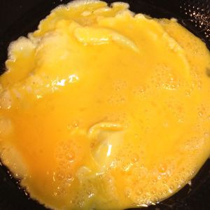 3颗鸡蛋打散加入少许盐,锅中放适量油先将鸡蛋摊成型。