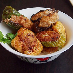 10分钟后把辣椒和茄子一起加入煮10分钟就可以了。油豆腐的肉馅多所以必须先煮,苦瓜也比较难熟所以也是先煮,茄子和辣椒是快熟的所以后面才加入。