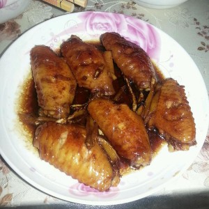 倒入可乐、酱油,放少量鸡精、姜丝小火熬制,到最后可乐几乎干时,开大火收锅!