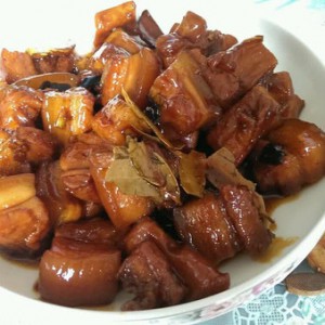 热油锅,将生姜辣椒放油里爆一下,倒入五花肉翻炒至略带金色,然后倒入适量生抽,老抽少许,翻炒上色。再倒入压肉时的汤汁,盖过肉就好,加入适量冰糖,放入葵香,香叶。大火闷煮。