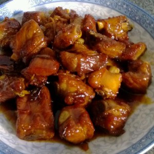 锅中留少量油,放入生姜、香葱、红椒微炸一下,倒入排骨,加水没过排骨,然后加入老抽、冰糖、醋。一直到水烧干收汁。这里给干红椒是口味不同,喜欢辣的可以给不喜欢就不给了。