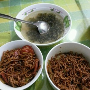 3、油锅八分熱时放入面条翻炒,至水分稍干时加适量老抽、盐调味,加入刚才炒好的食材后继续翻炒,等面条水分基本没有的时候加入葱花起锅来吃,再配个紫菜蛋花虾米汤就更是锦上添花了哦!