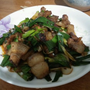 猪肉在煮的过程中,就可以配菜了。蒜苗洗干净,切成大约5厘米左右的段,盛盘备用。生姜洗干净切片备用。