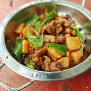 烧到水分渐少,出锅前几分钟加入青椒块。