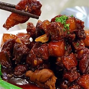 小火慢炒至糖融化,其间要不断地翻炒,一是避免糖粘锅,二是使糖汁裹在肉块上