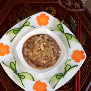 调入凉拌用生抽、醋、盐、香油、北京人喜欢在拌这样爽口的凉菜时滴上几滴芥末油,再放入蒜末拌匀即可。