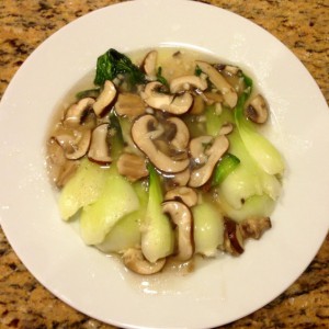 洗净锅,热锅凉油小火,加入香菇、蒜炒香,加少许水煮1分钟,加入水凉粉勾芡。将做好的芡汁浇在油菜上即可。