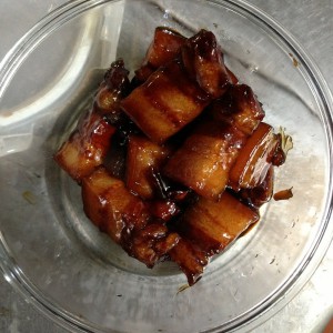 五花肉冷水下锅煮,烧开后加冷水继续烧,一直到用筷子可以插透中间肥肉层