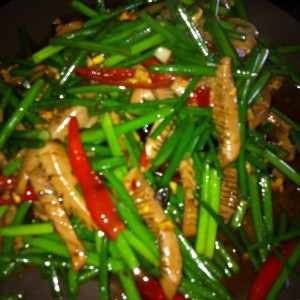 大蒜、老姜、泡椒、韭花 待腰花炒到快熟倒进去一起炒。