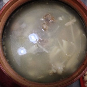 竹笋切块、姜拍散、水和排骨一起放入砂锅中,先大火烧滚再转小火煮半小时下盐即可。