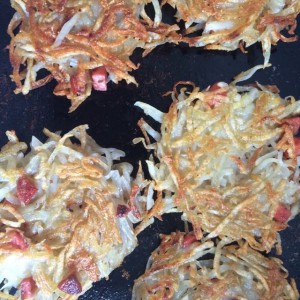 平底锅中放入少量油,把土豆丝窜成团饼状,开小火,一直煎。