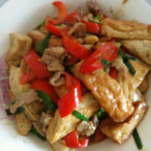 放入豆腐,加盐,鸡精,翻炒一下,放入葱,加水煮一会,用生粉勾,起锅装盘