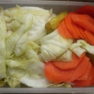 盒子中放入白菜胡萝卜和泡椒 倒入调好的汤汁 密封 一周后即可食用