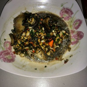 步骤3:把鳕鱼放入盘中,把切好的香菇片摆在鳕鱼上,均匀的浇上调制好的味汁。