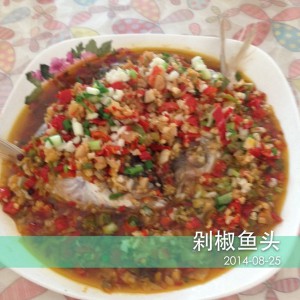 把炒好的作料洒在鱼头上,再倒点蒸鱼豉油。