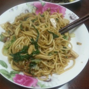 炒面的时候用筷子别用锅铲 大火五分钟左右就可以放入酱油 等面条着色均匀就可以出锅了