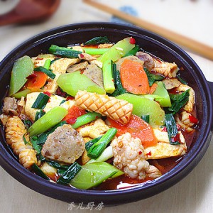 准备处理好的莴笋,大蒜叶,鱿鱼,牛肉贡丸切片,猪肉片和胡萝卜片