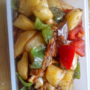 茄子半个切滚刀块,鸡蛋淀粉搅匀,每个茄块上都挂一层糊,入油锅炸。