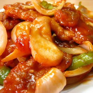 加少许油,倒入番茄沙司、糖、白醋,炒红炒香,加入炒过的蔬菜及肉片,加少许盐、鸡精,拌炒至均匀裹上酱汁,出锅。