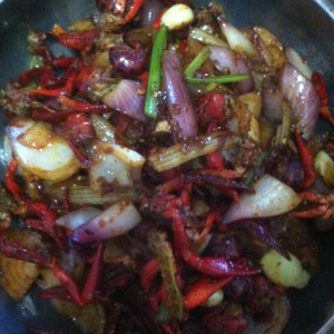将油锅放入姜蒜,冰糖,豆瓣酱,干辣椒,花椒,洋葱一起翻炒,再放入炸过的小龙虾一起翻炒,这时候可加入少量的水,再放入土豆片,不喜欢的可不放,最后再倒入酱油,盐,味精,放入芹菜截便可起锅啦