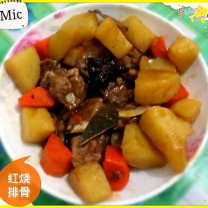 将上述材料放入锅中,加入料酒、八角、香叶、葱,加入水没过排骨。加热30分钟。