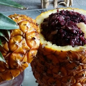 糯米蒸熟后和菠萝混合,回锅再蒸十分钟。