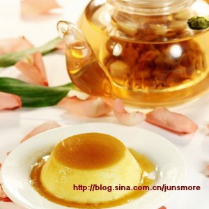 在烤盘里注入热水,高度至少要超过布丁液的一半。然后把烤盘放入预热好的烤箱烤焙。中层,165度,35分钟左右,直到布丁液凝固。烤好的布丁冷藏食用味道更佳。