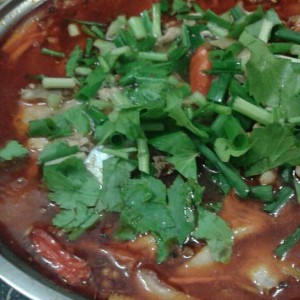 鱼片烫熟后加入葱花,芹菜叶,这盆麻辣水煮鱼就成功了!不错吧!