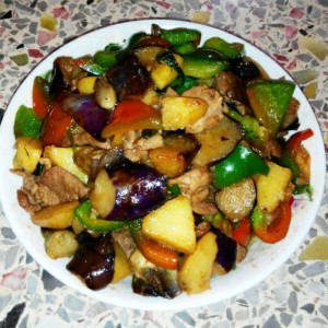 锅里放油大火烧高温度倒入土豆、茄子炸到金黄色沥油备用,青椒也过一下热油,锅里留一点点油爆香葱姜蒜小辣椒(做给孩子吃我没放辣椒),先倒入肉片翻炒变色再倒入料汁(倒之前先搅拌一下)和所以主料翻炒入味出锅