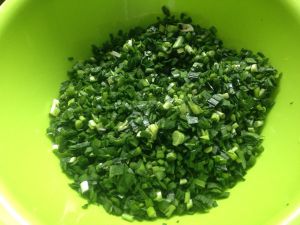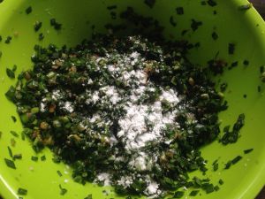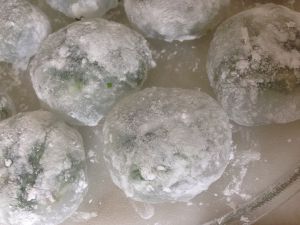 韭菜放去皮中 包成小圆包状 再裹上粉(包的过程中会粘手,可以边撒粉喔)